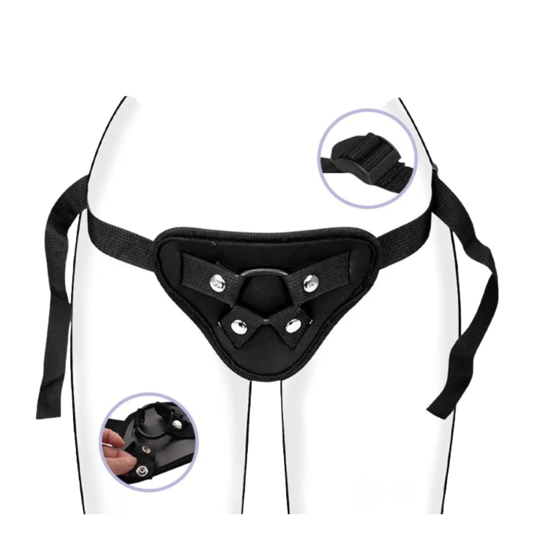 Viene incluido un arnés simple para practicar pegging o para pareja que desean experimentar la penetracion realista, con correas ajustables, 3 anillos intercambiables y una superficie interna recubierta de goma suave.